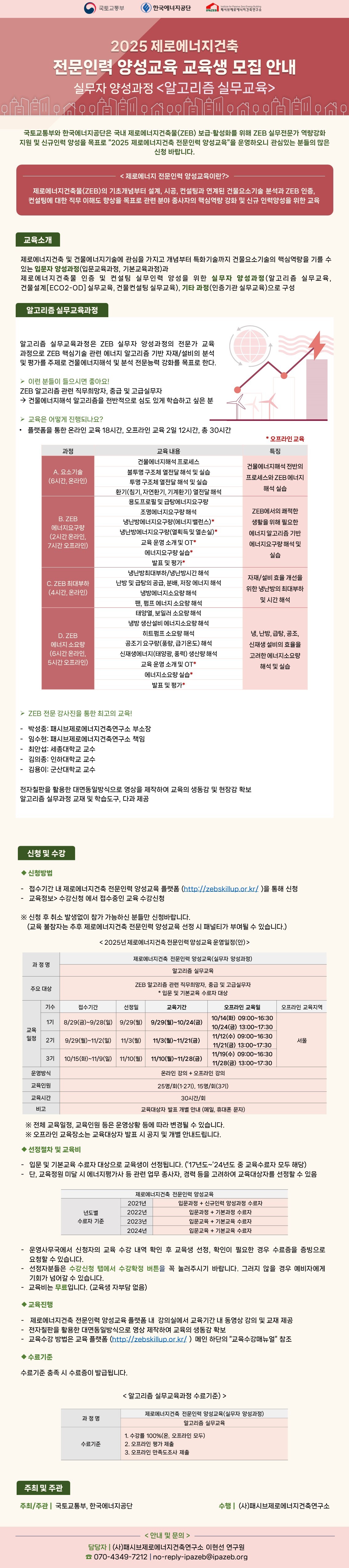 2025년도 [알고리즘 실무교육] 모집공지(1기~3기) **기수 추가** 작성자 관리자 작성일 2025-08-29 10:24 조회 1007 2025년도 제로에너지건축 전문인력 양성교육 [알고리즘 실무교육] 모집 공지 드립니다. 인쇄 « 2025년도 [기본교육] 모집공지(1기~6기) 2025년도 [건물컨설팅 실무교육] 모집공지(1기~2기) » 목록보기